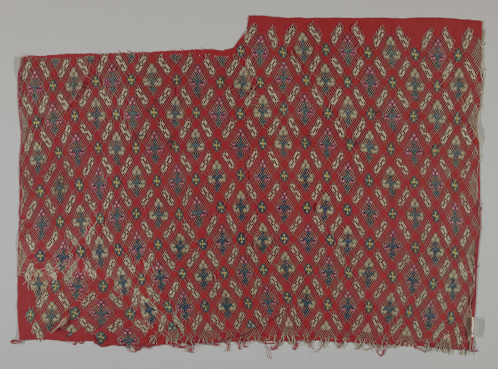 This is a Fragment. It is dated 19th–late 20th century and we acquired it in 1971. Its medium is silk and its technique is needlework on hand knotted net. It is a part of the Textiles department.