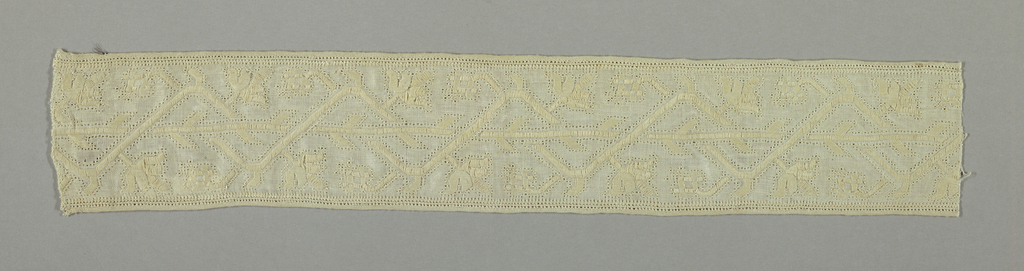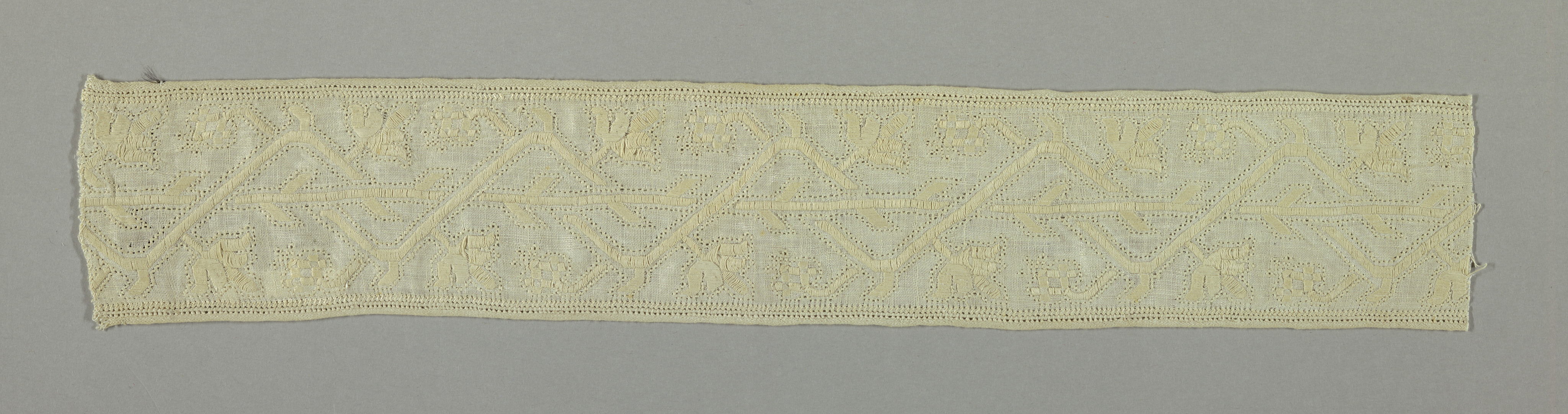 This is a Band. It is dated 17th century and we acquired it in 1971. Its medium is linen and its technique is plain weave embroidered with deflected element work. It is a part of the Textiles department.
