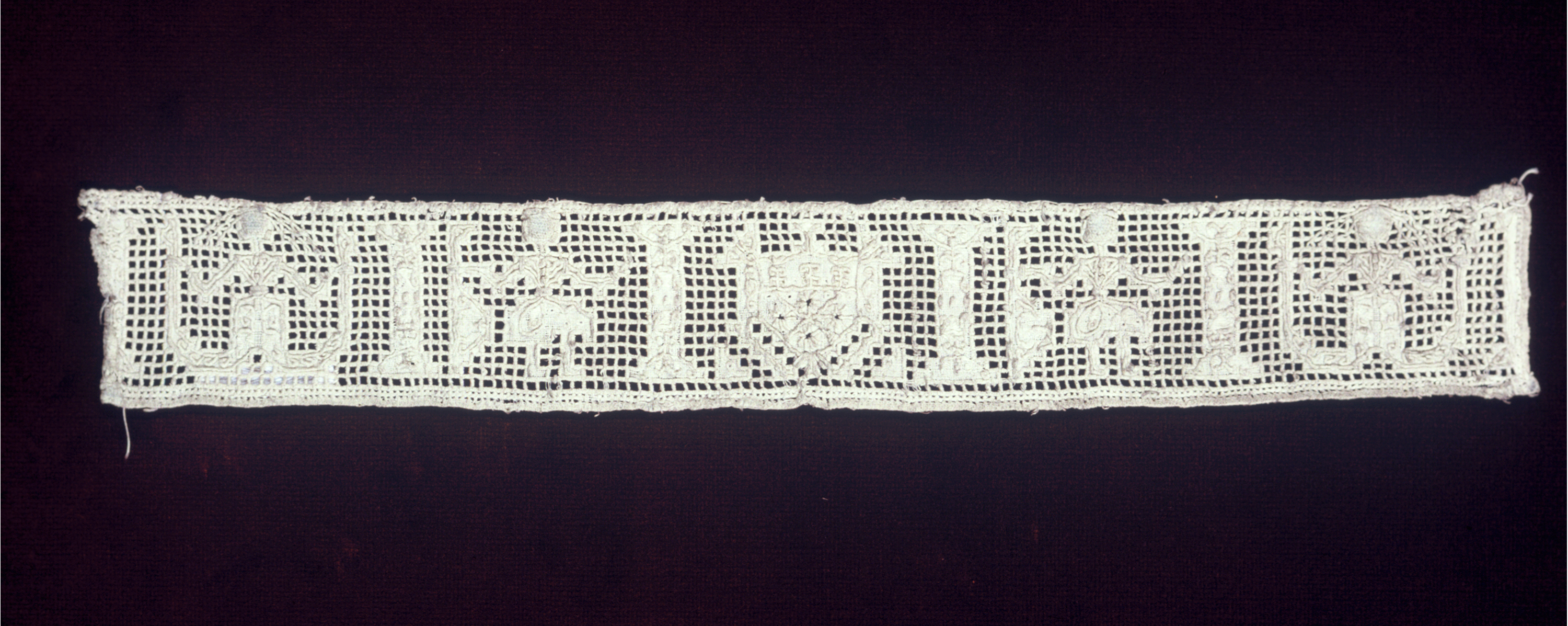 This is a Band. It is dated 17th century and we acquired it in 1971. Its medium is linen and its technique is plain weave embroidered with deflected element work. It is a part of the Textiles department.