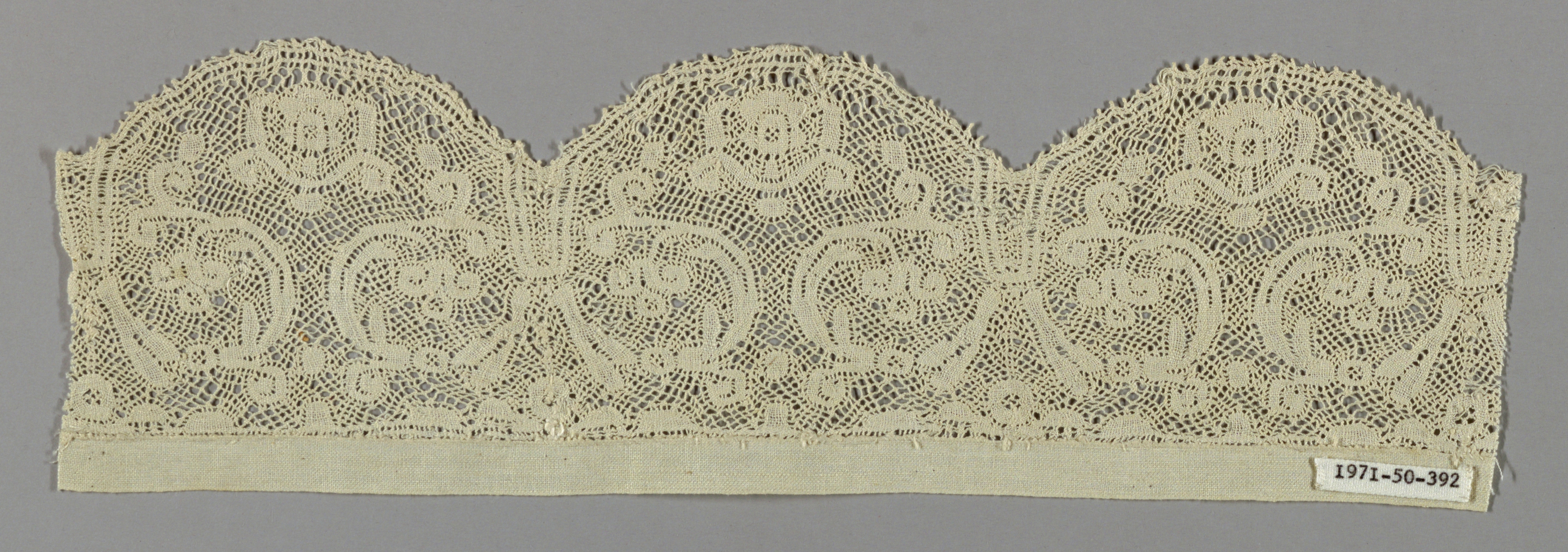 This is a Fragment. It is dated late 17th century and we acquired it in 1971. Its medium is linen and its technique is bobbin lace, valencienne style with twisted ground. It is a part of the Textiles department.