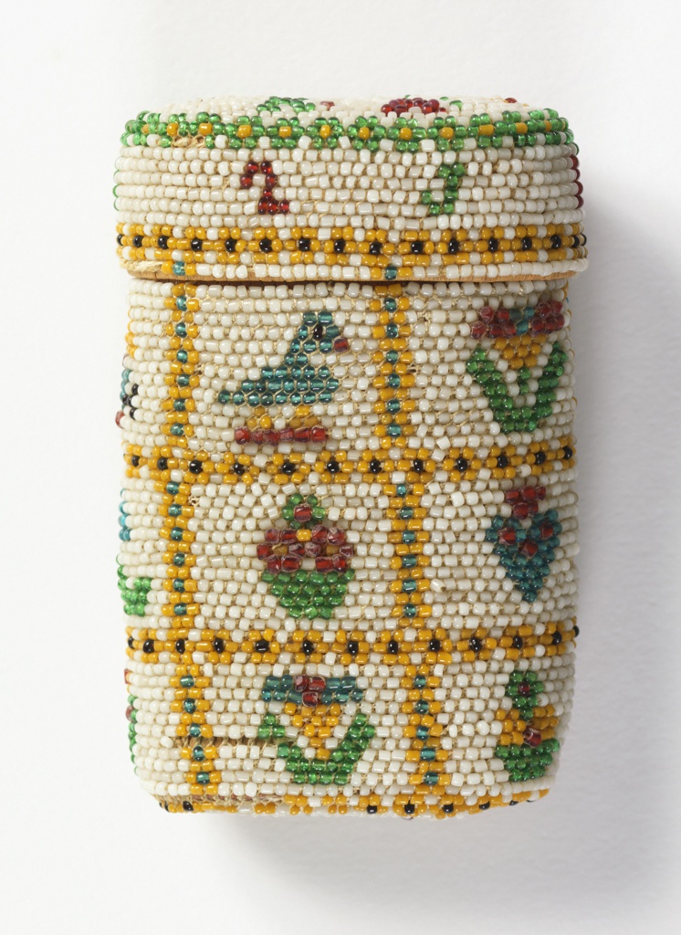 This is a Case. It is dated 18th–19th century and we acquired it in 1971. Its medium is silk, glass beads, reeds and its technique is looping incorporating strung beads worked directly onto basketry. It is a part of the Textiles department.