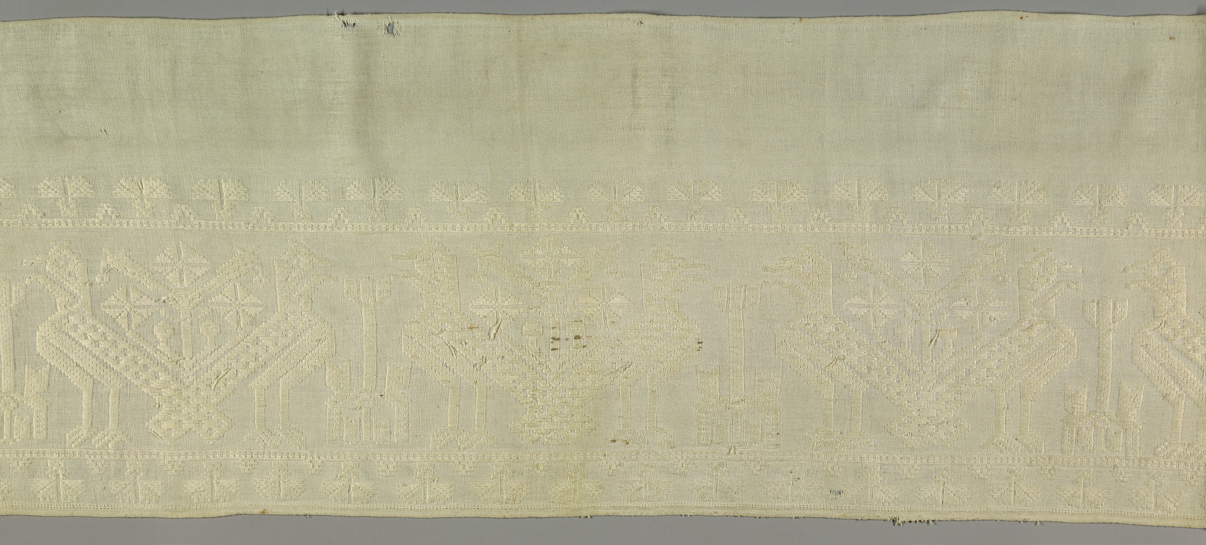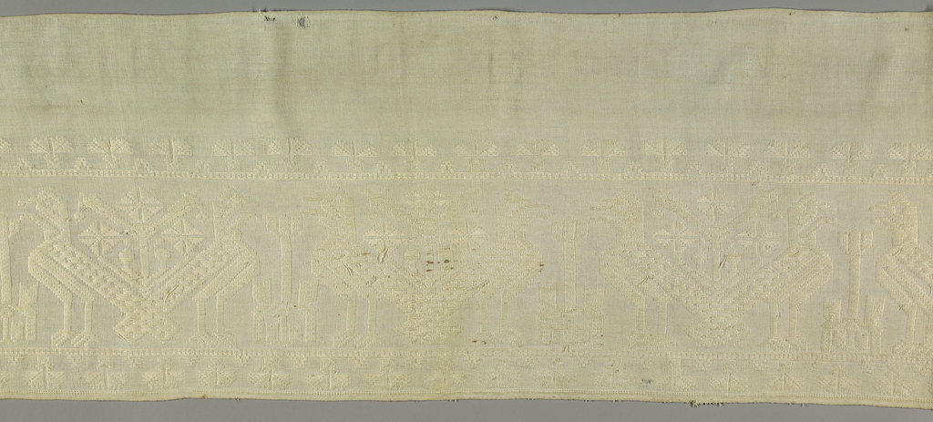 This is a Valance. It is dated 17th century and we acquired it in 1971. Its medium is cotton, linen and its technique is embroidered. It is a part of the Textiles department.