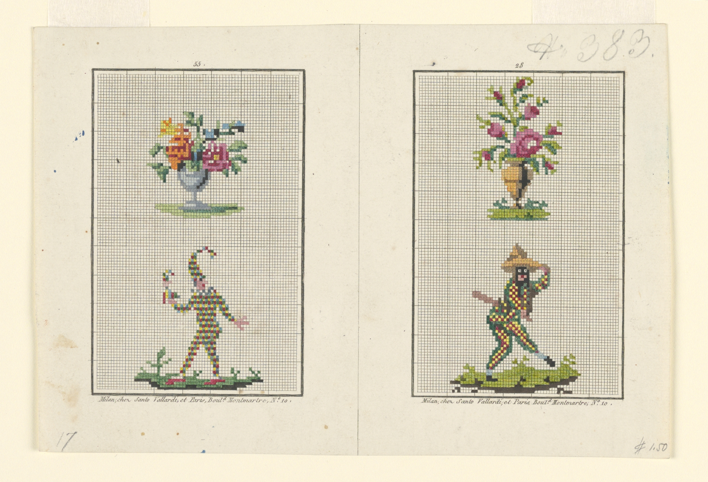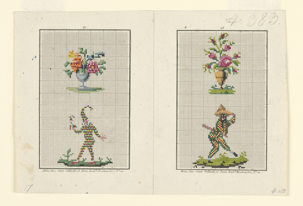 Drawing, Embroidery Design of Two Commedia dell'Arte Figures; Published by Santo Vallardi, Milan & Paris; Italy; brush and gouache on pre-printed squared laid paper; 15.5 x 22.1 cm (6 1/8 x 8 11/16 in.); Bequest of Marian Hague; 1971-71-31