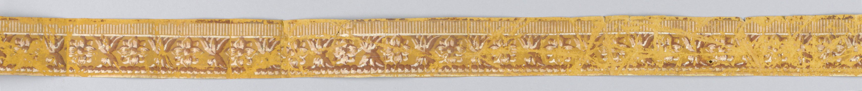 This is a Border. It is dated 1796–1830 and we acquired it in 1972. Its medium is block-printed on handmade paper. It is a part of the Wallcoverings department.