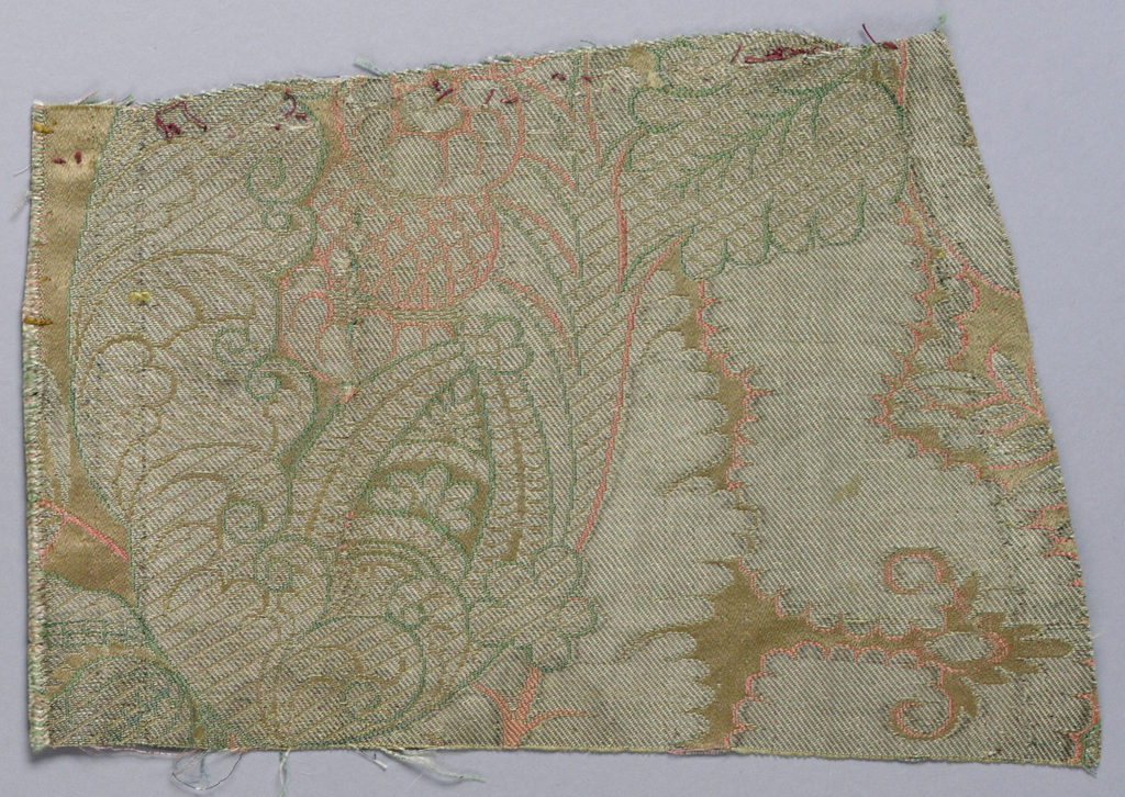 This is a Fragments. It is dated early 18th century and we acquired it in 1972. Its medium is silk, metallic thread and its technique is 8-harness satin patterned by weft floats (alternate wefts are a complementary pair) plus a continuous supplementary weft; all weft floats (including supplementary weft) bound in 3/1 twill weave by a supplementary warp. It is a part of the Textiles department.
