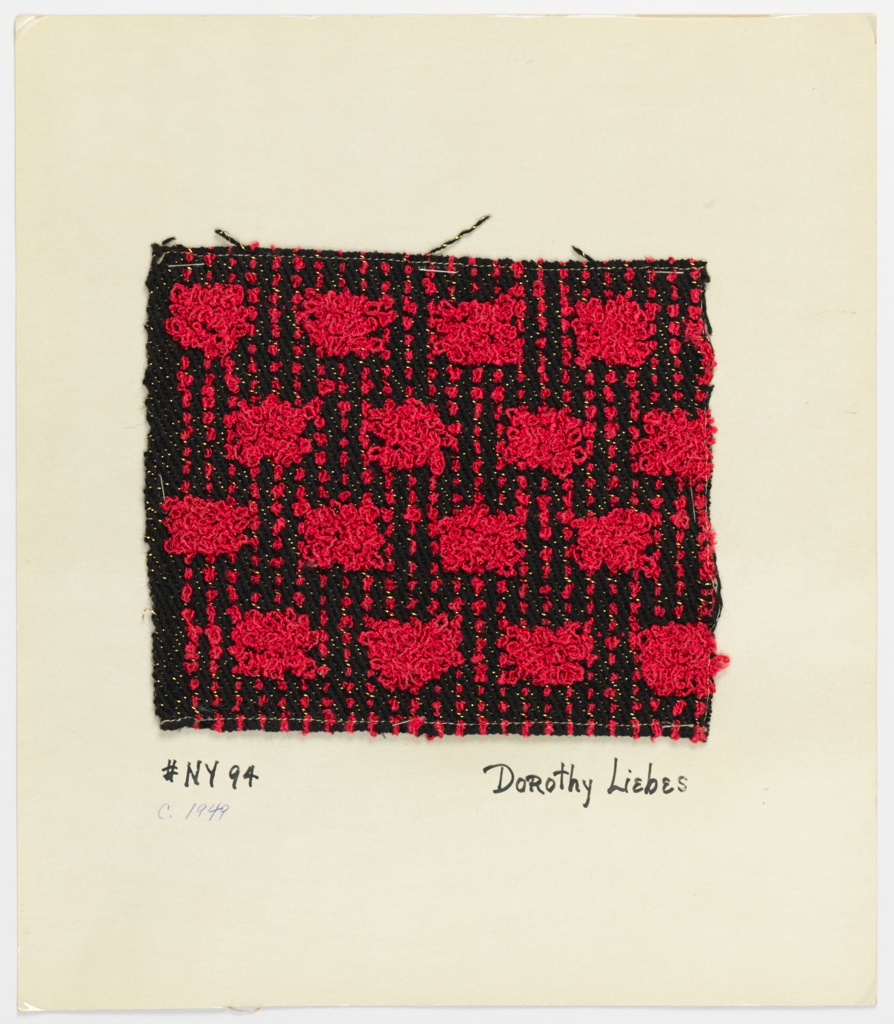 This is a Sample card. It was designed by Dorothy Wright Liebes and woven by Dorothy Wright Liebes. It is dated ca. 1949 and we acquired it in 1972. Its medium is cotton, viscose rayon, wool, cellulose acetate-laminated aluminum yarn and its technique is 2/2 twill woven with supplementary warp. It is a part of the Textiles department.