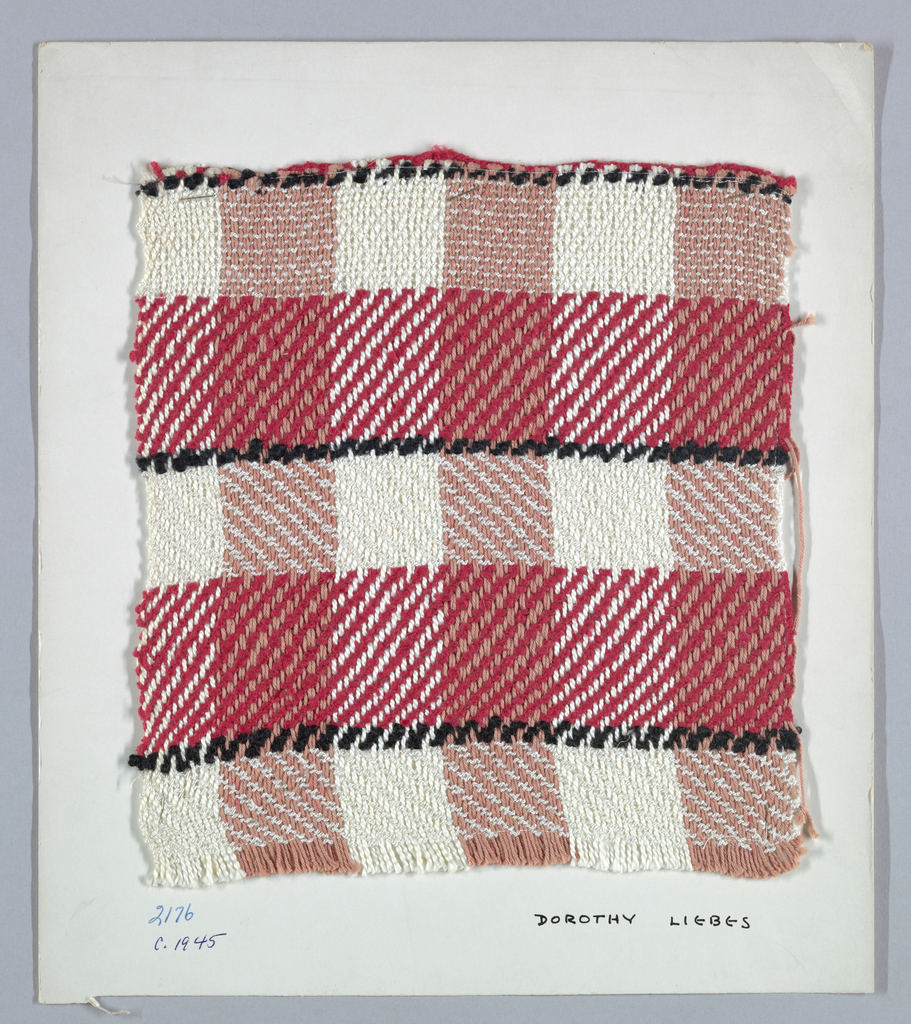 This is a Sample card. It was designed by Dorothy Wright Liebes and woven by Dorothy Wright Liebes. It is dated ca. 1945 and we acquired it in 1972. Its medium is cotton, viscose rayon, silk and its technique is 2/2 twill woven; white warps operate singly and red warps are alternately paired and single. It is a part of the Textiles department.
