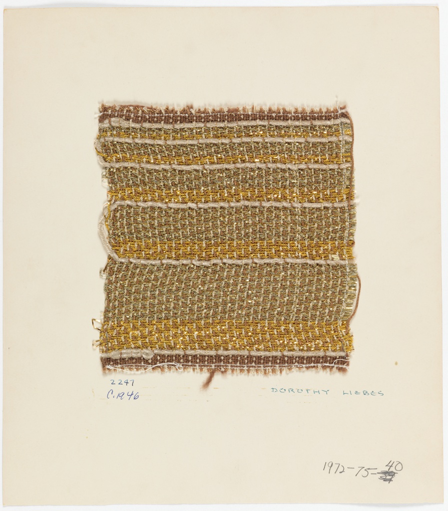 This is a Sample card. It was designed by Dorothy Wright Liebes and woven by Dorothy Wright Liebes. It is dated ca. 1946 and we acquired it in 1972. Its medium is cellulose triacetate, cotton, viscose rayon, wool-viscose rayon blend, silk, cellulose acetate-laminated aluminum yarn, cellulose acetate butyrate-laminated aluminum yarn and its technique is 2/2 twill woven. It is a part of the Textiles department.