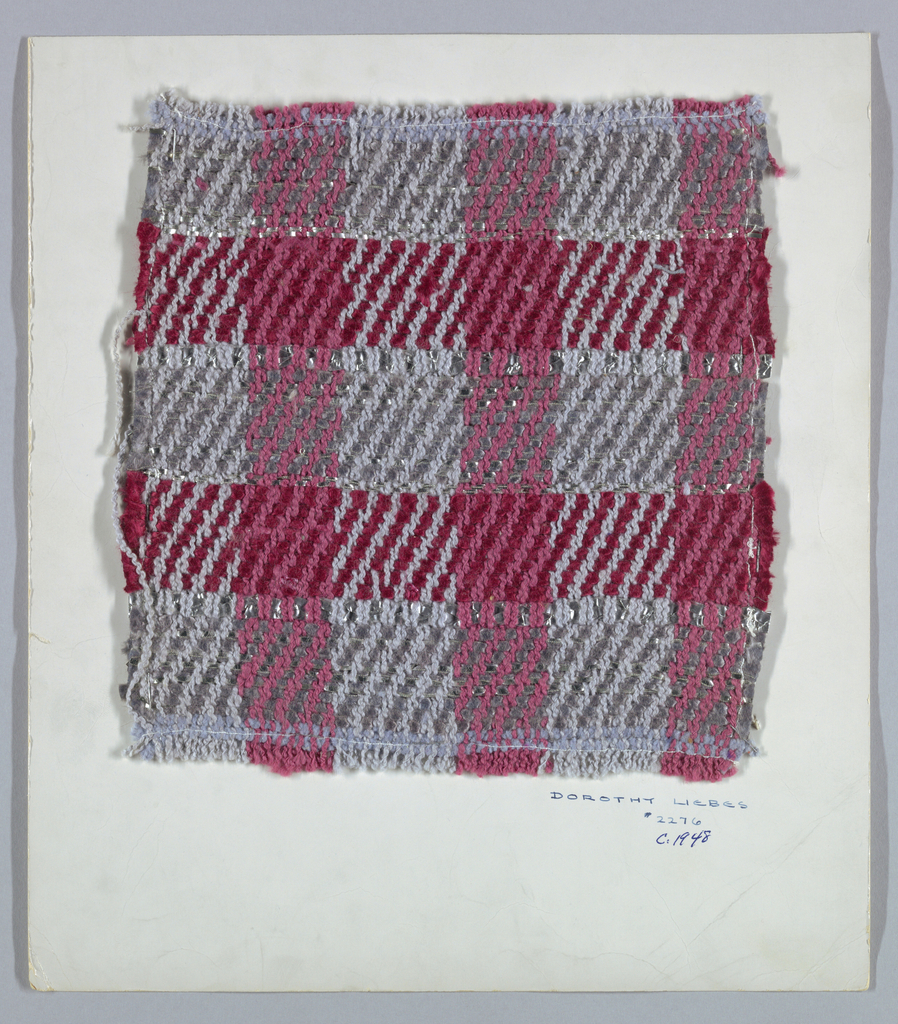 This is a Sample card. It was designed by Dorothy Wright Liebes and woven by Dorothy Wright Liebes. It is dated ca. 1948 and we acquired it in 1972. Its medium is cotton, viscose rayon, silk, cellulose acetate-laminated aluminum yarn, cellulose acetate butyrate-laminated aluminum yarn and its technique is 2/2 twill plain woven. It is a part of the Textiles department.