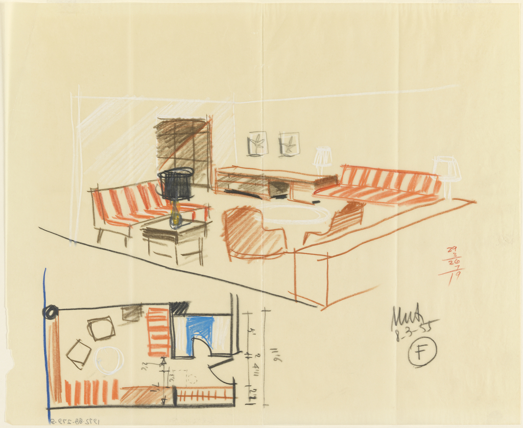 Drawing, Sketch for room interior, for Uris Hotel; Designed by Henry Dreyfuss Associates (United States); USA; crayon on off-white tracing paper; 34.8 x 42.8 cm (13 11/16 x 16 7/8 in.); Gift of Henry Dreyfuss; 1972-88-390