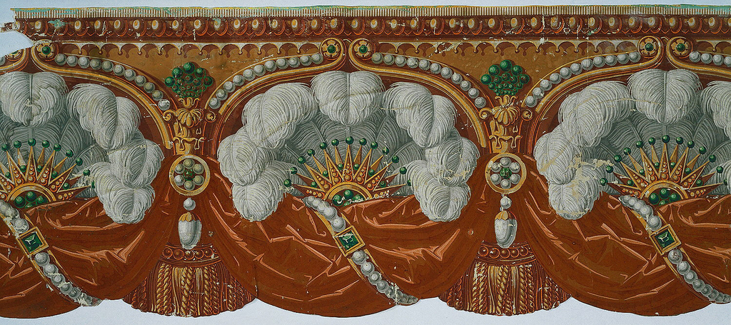 The concept of "tenting" a room—or draping the walls with fabric—was popularized by architects Percier and Fontaine, under the direction of Napoleon at the turn of the 19th century. This fashion was soon translated into wallpaper designs, which were less expensive and easier to install than actual fabrics. Drapery papers could be purchased in the form of sidewalls, borders, and friezes like this example.