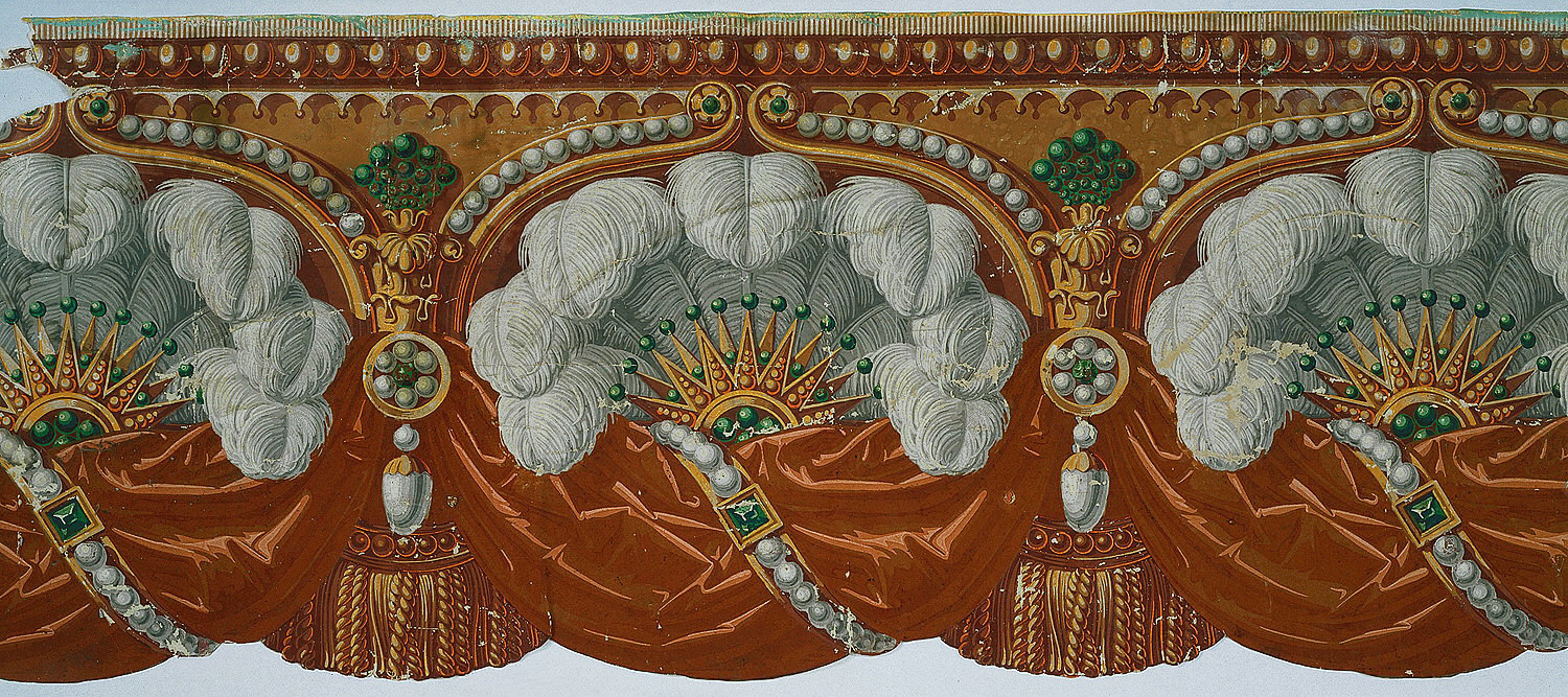 I have always been captivated by the realism and voluptuousness of this frieze. This trompe l’oeil design, with its drapery swags, ostrich plumes, jewels, and tassels, is an over-the-top depiction of luxury materials. The attention to detail required to bring this degree of realism to light is exemplary. The drapery swags are flocked, then overprinted with several colors to create highlights and shadows that better capture the look of silk velvet. The bottom edge of the frieze is cut out, further enhancing the 3-D quality of the swags and tassels. The ostrich plumes are delicately printed so they appear light and fluffy and seem to project out from the wall. The pearls and gemstones are each printed in five to six different monochromatic shades in order to achieve the sense of roundness that makes it seem as though they could be plucked off the paper.