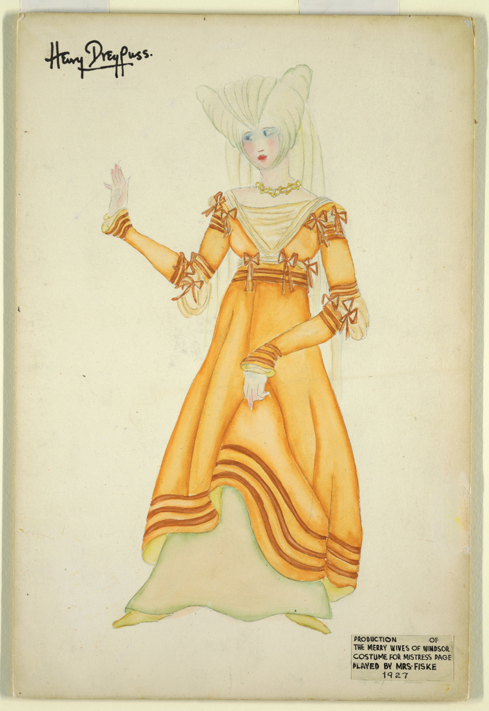 Inscribed in pen and black ink on off-white wove paper pasted to board, bottom right: PRODUCTION OF / THE MERRY WIVES OF WINDSOR / COSTUME FOR MISTRESS PAGE / PLAYED BY MRS. FISKE / 1927. verso, top left, clockwise from top left: in pen and blue ink: DPE - 18 - E / in graphite: 3 f---- (indecipherable) / (in graphite) 3/4 E- / stamped in black ink: CP / in pen and black ink: 3; verso, in graphite, across top: 10" x 15" /