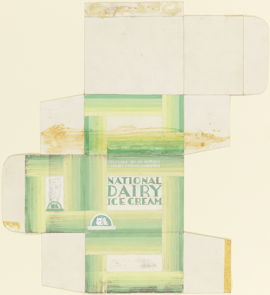 Drawing, Product Label for National Dairy Ice Cream; Designed by Henry Dreyfuss Associates (United States); USA; brush and gouache on thick white paper; 21.4 x 27.5 cm (8 7/16 x 10 13/16 in.), irregular; Gift of University of California, Los Angeles; 1973-15-51