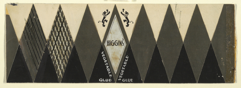 Drawing, Design for Product Label, Higgins' Vegetable Glue; Designed by Henry Dreyfuss (American, 1904–1972); USA; brush and blue, white gouache, paper strips, graphite on paper; 9.5 x 28.8 cm (3 3/4 x 11 5/16 in.); Gift of University of California, Los Angeles; 1973-15-71