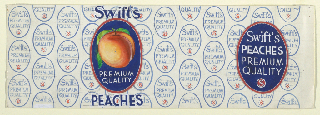 Drawing, Product Label for Peaches, Swift and Co.; Designed by Henry Dreyfuss Associates (United States); USA; brush and gouache, watercolor, graphite on heavy paper; 11 x 33 cm (4 5/16 in. x 13 in.); Gift of University of California, Los Angeles; 1973-15-81