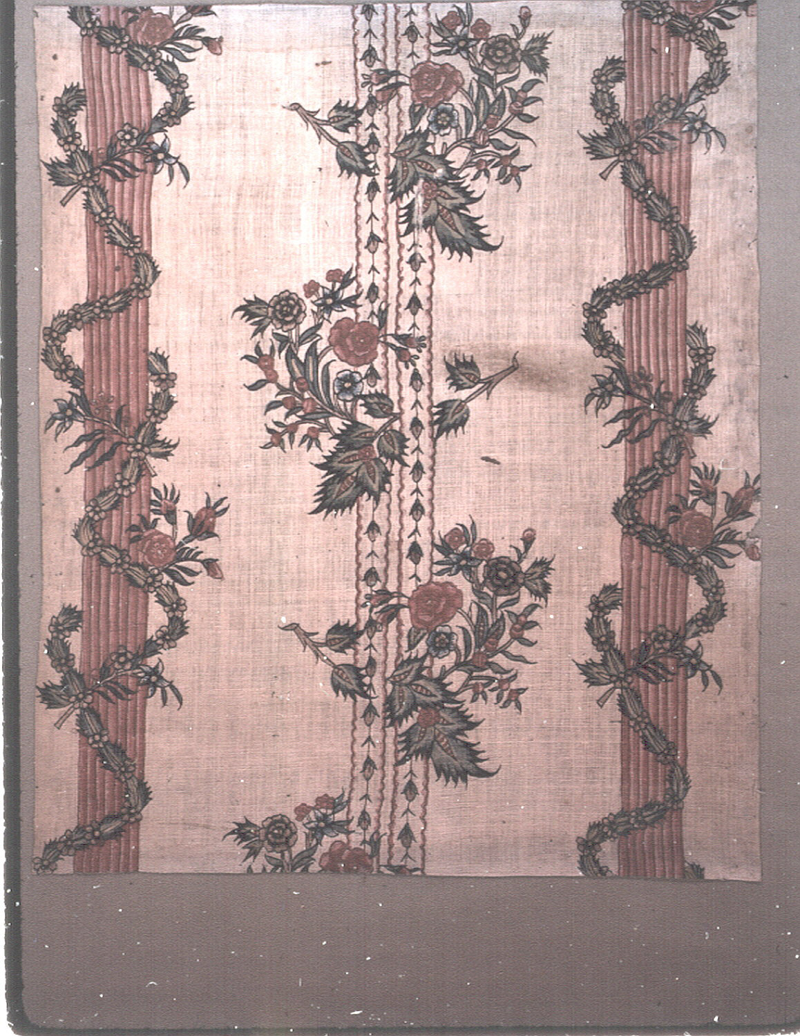 This is a Chintz. It is dated 18th century and we acquired it in 1973. Its medium is cotton and its technique is mordants for black, brown and 3 reds applied by pen and brush; madder dyed; blue applied by brush over resist; yellow applied by brush; chintz on plain weave. It is a part of the Textiles department.