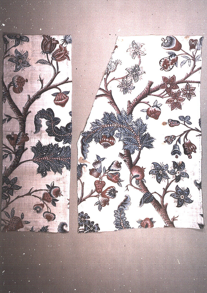 This is a Chintz fragments. We acquired it in 1973. Its medium is cotton and its technique is mordants (black, 3 reds, 2 purples) applied by brush, sometimes over resist; madder dyed; blue applied over resist; chintz on plain weave. It is a part of the Textiles department.