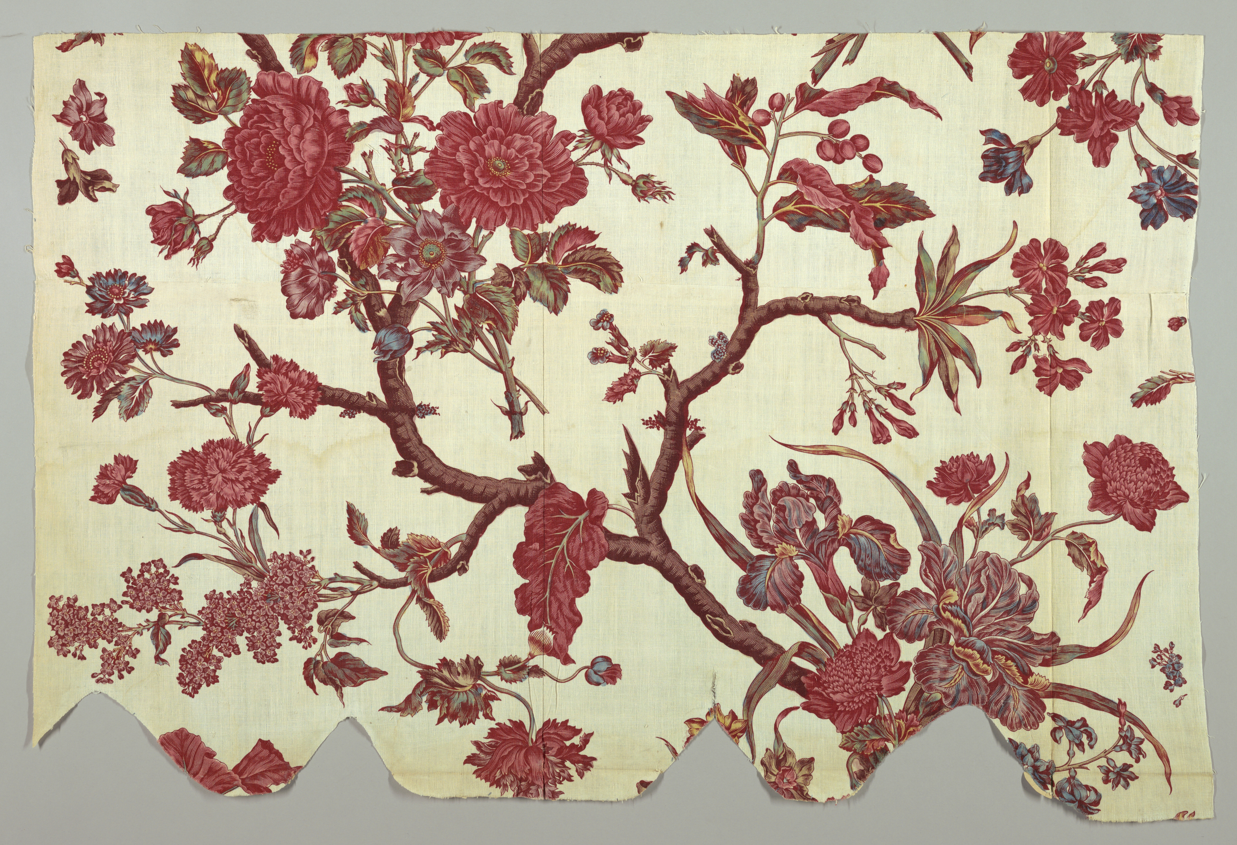 This is a Fragment. It is dated late 18th century and we acquired it in 1973. Its medium is cotton and its technique is plate printed on plain weave; pink, purple, brown, blue and yellow added by brush. It is a part of the Textiles department.
