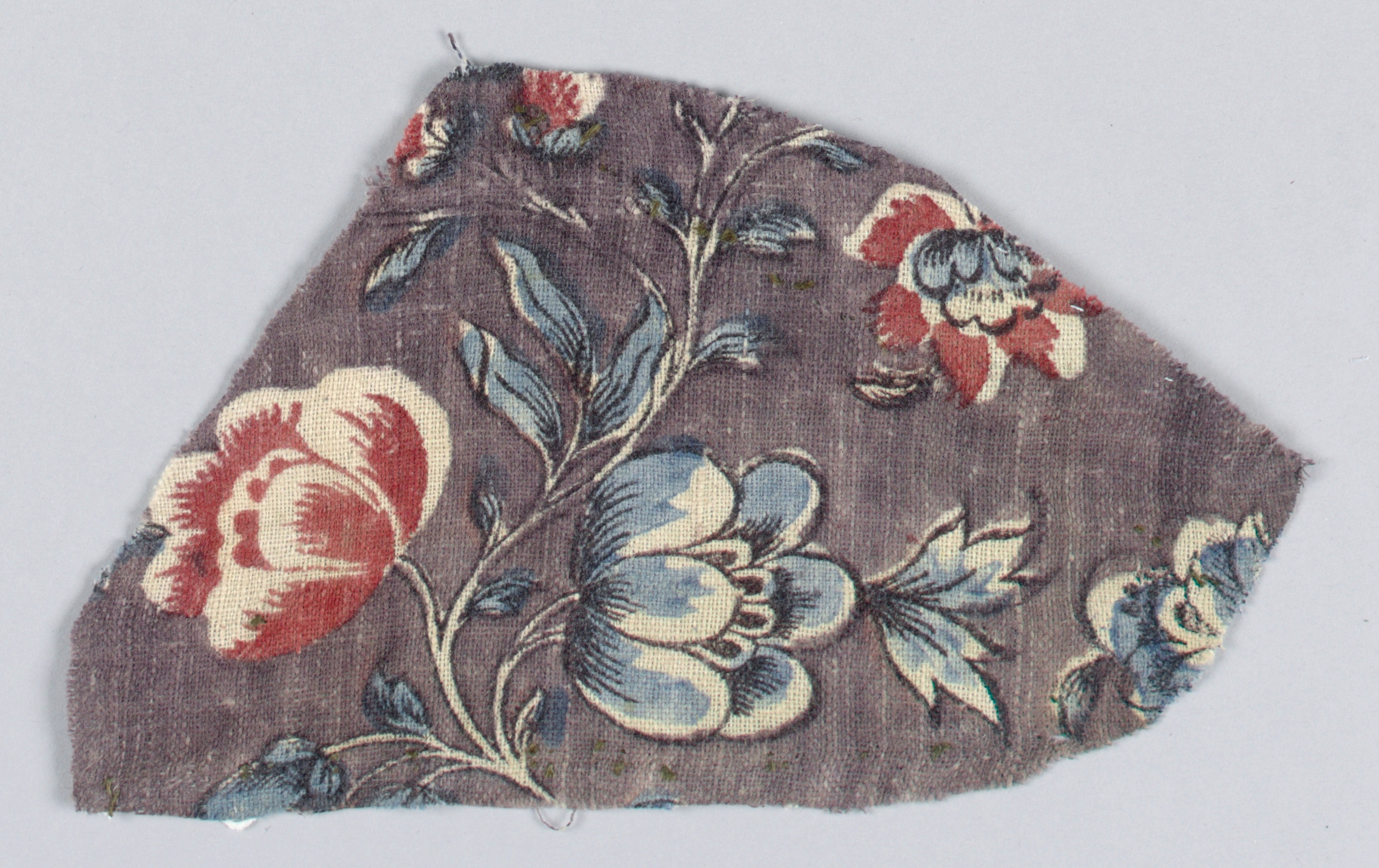 This is a Fragments. It is dated late 18th century and we acquired it in 1973. Its medium is cotton and its technique is plain weave, block printed: black, red, purple and blue. It is a part of the Textiles department.