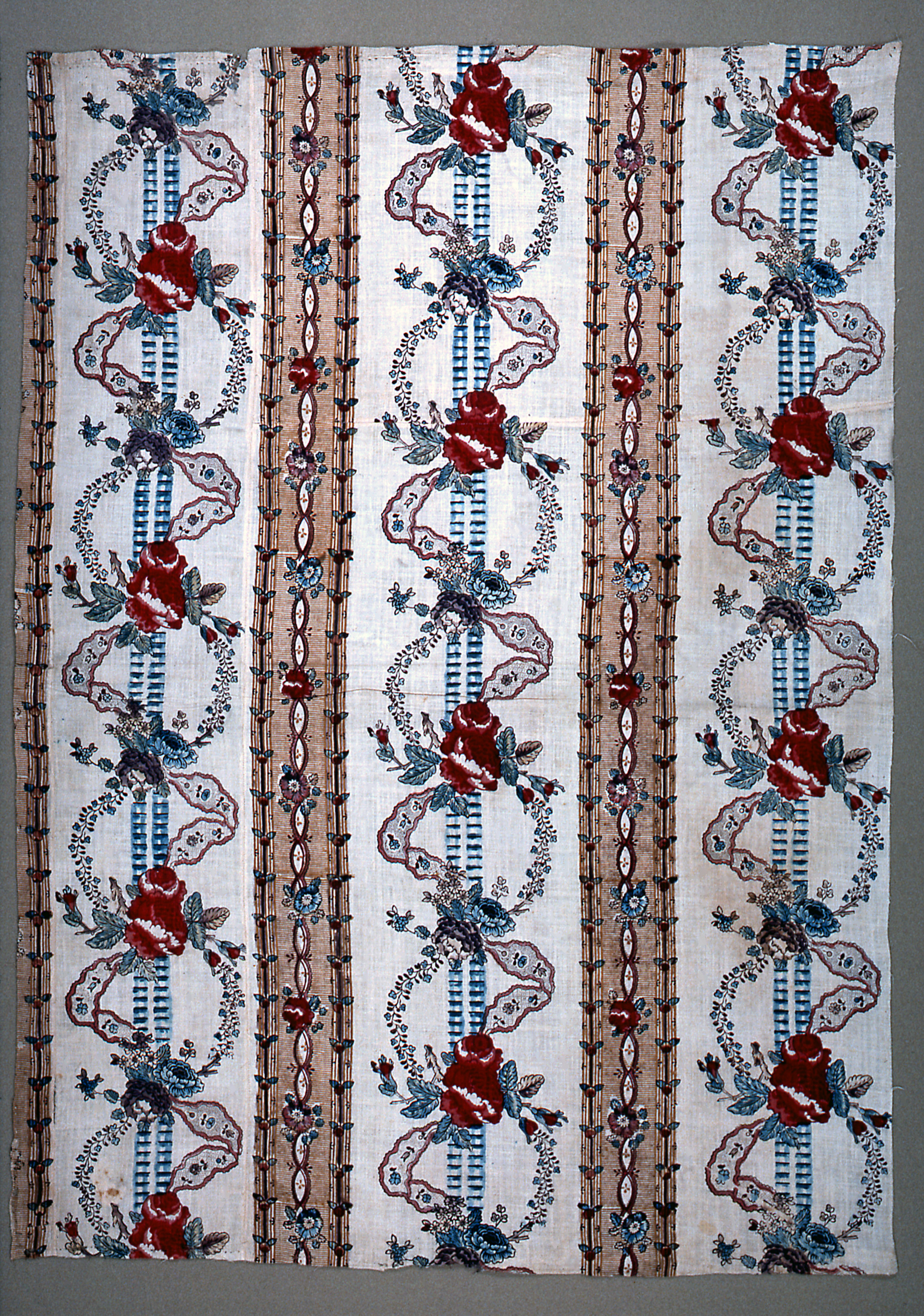 This is a Textile. It is dated 1750–1800 and we acquired it in 1973. Its medium is cotton and its technique is block printed on plain weave (black, two reds, two purples, two blues, and dark yellow). It is a part of the Textiles department.