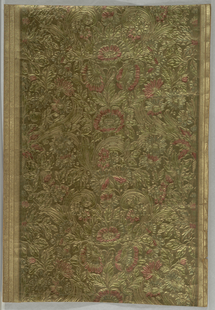 This is a Sidewall. It is dated 1875–99 and we acquired it in 1973. Its medium is block-printed paper, embossed, hand-rubbed oil finish. It is a part of the Wallcoverings department.