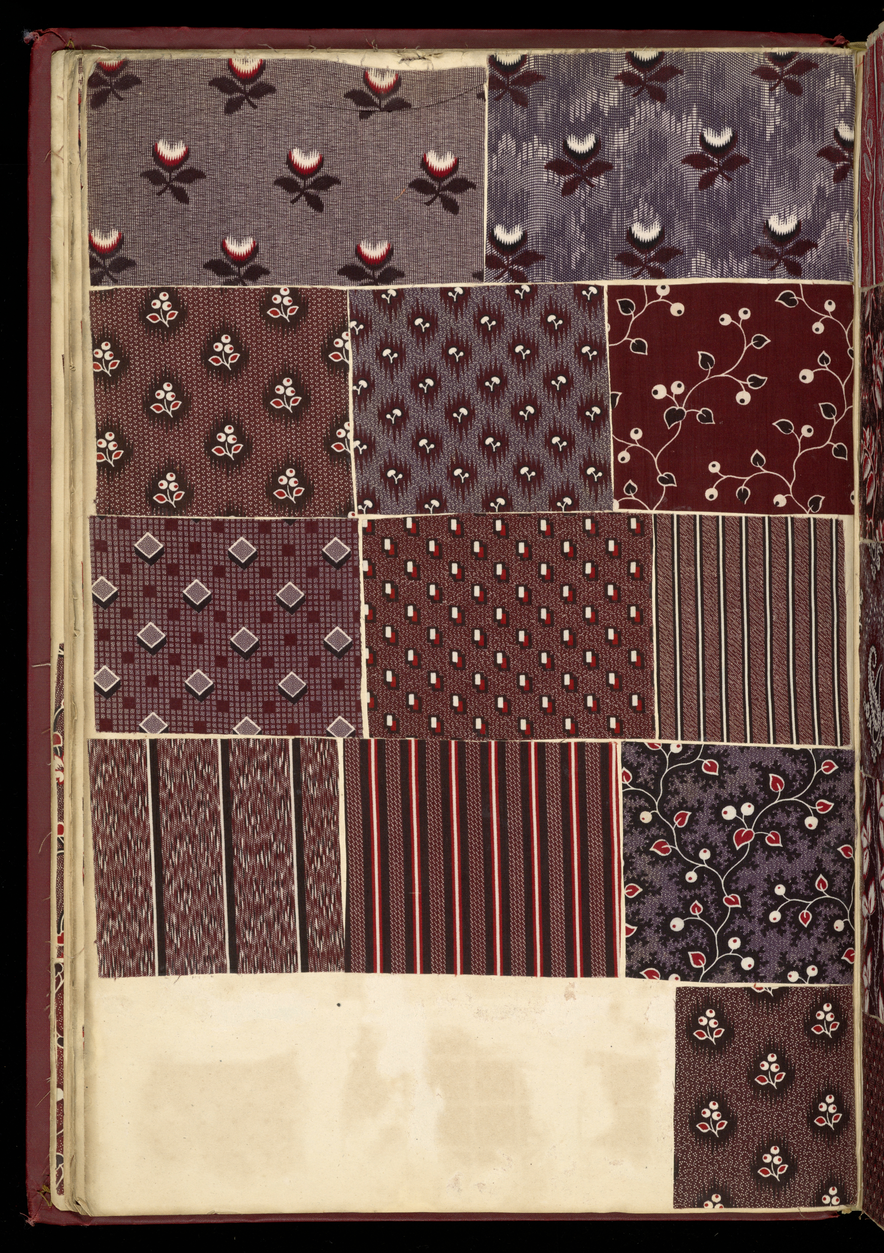 This is a Scrapbook of textile swatches. It is dated 1850 and we acquired it in 1973. Its medium is paper, printed cotton textile samples. It is a part of the Textiles department.
