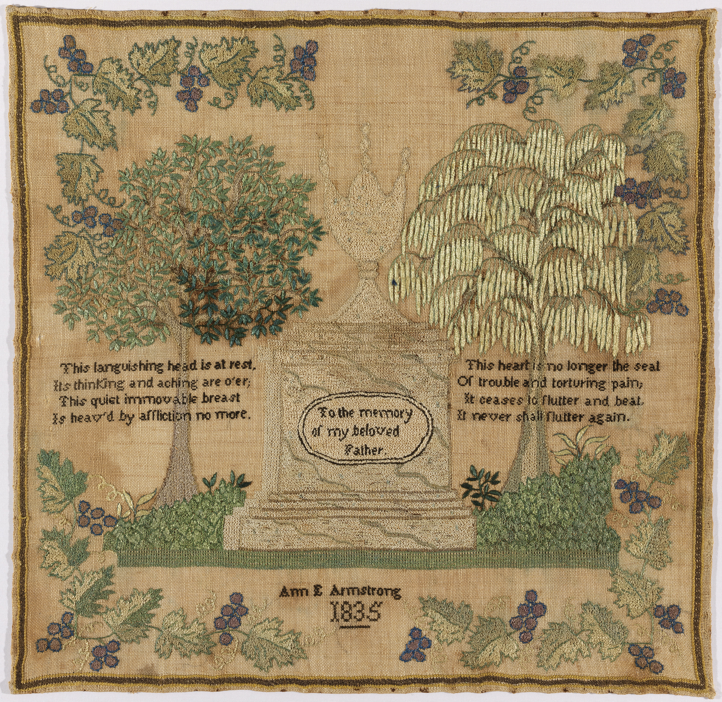 This is a Sampler. It was embroidered by Ann E. Armstrong. It is dated 1835 and we acquired it in 1974. Its medium is silk embroidery on linen foundation and its technique is embroidered on plain weave foundation. It is a part of the Textiles department.
