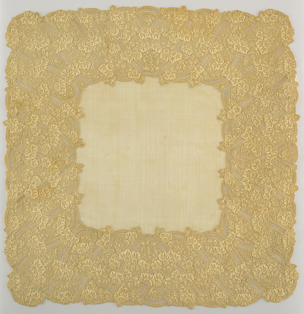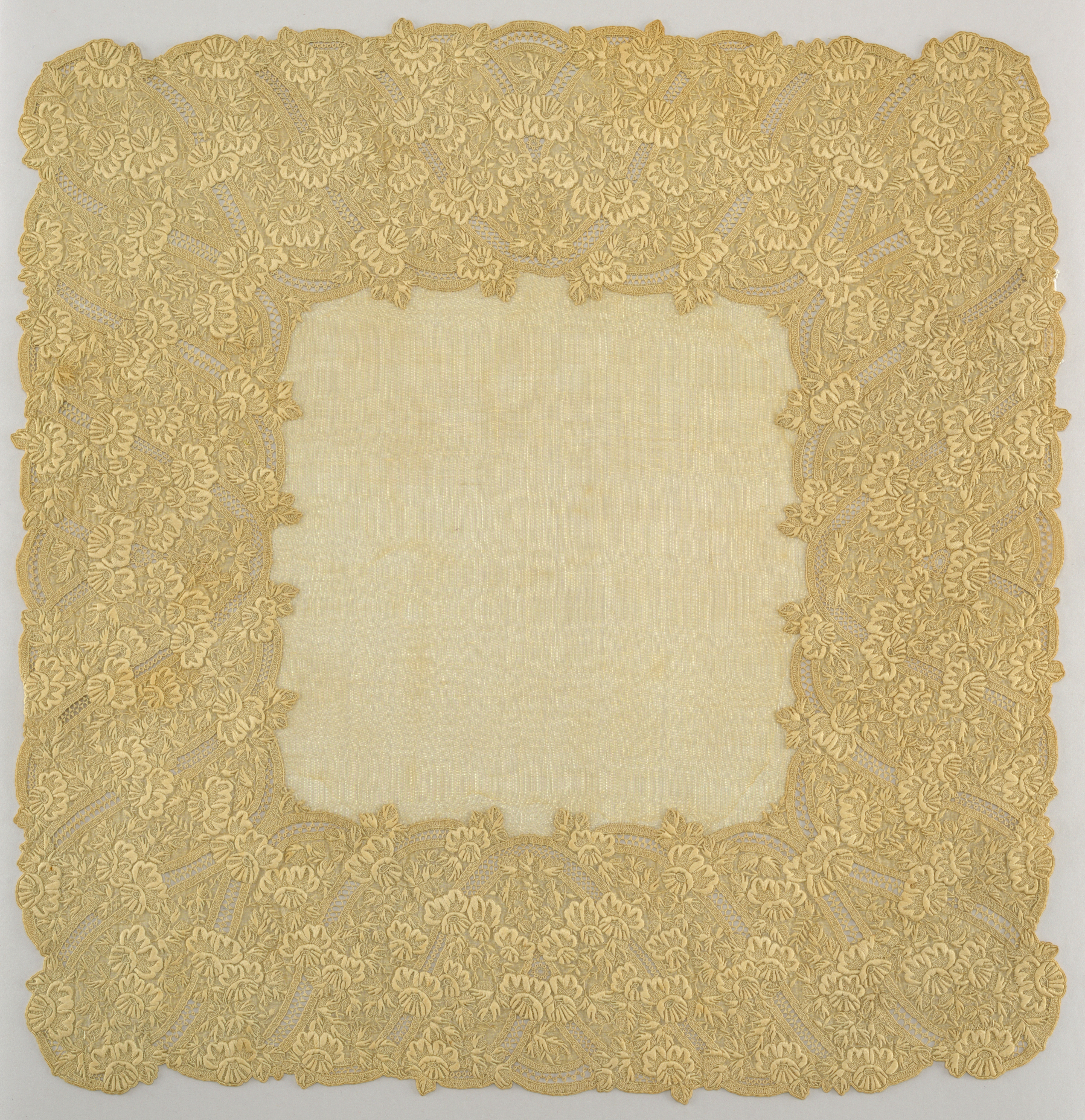 This is a Handkerchief. It is dated 19th century and we acquired it in 1974. Its medium is linen, cotton and its technique is cotton embroidery on linen plain weave. It is a part of the Textiles department.