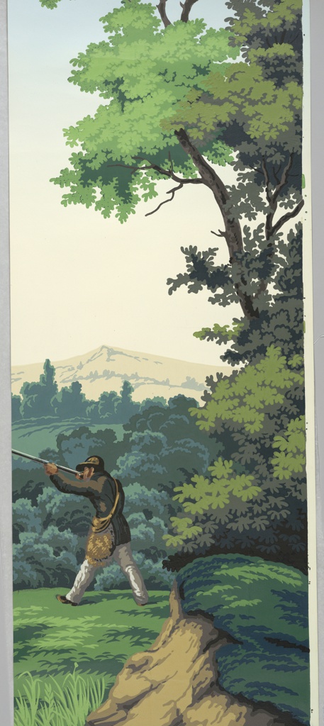 Scenic, Le Paysage a Chasses; Manufactured by Zuber & Cie (France); France; block printed on machine-made paper; L x W: 228 × 50 cm (7 ft. 5 3/4 in. × 19 11/16 in.); Gift of A.L. Diament & Co.; 1974-40-1-1/32
