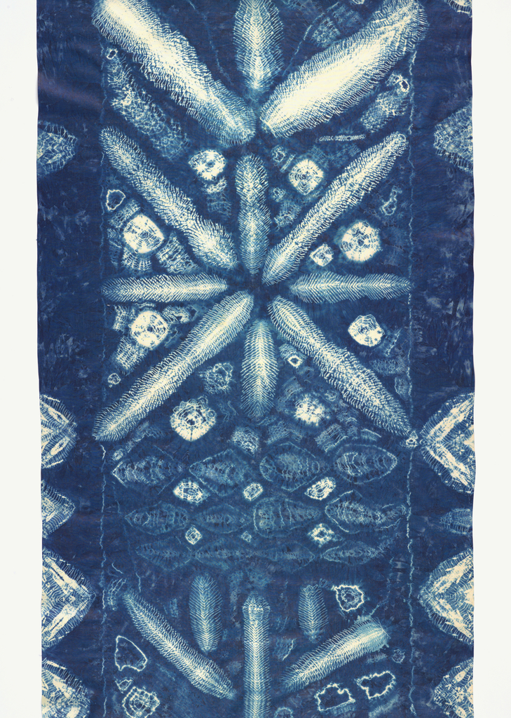 This is a Hanging. It was designed by Mary Dumas. It is dated 1935–71 and we acquired it in 1974. Its medium is cotton and its technique is stitch-resist dyed. It is a part of the Textiles department.