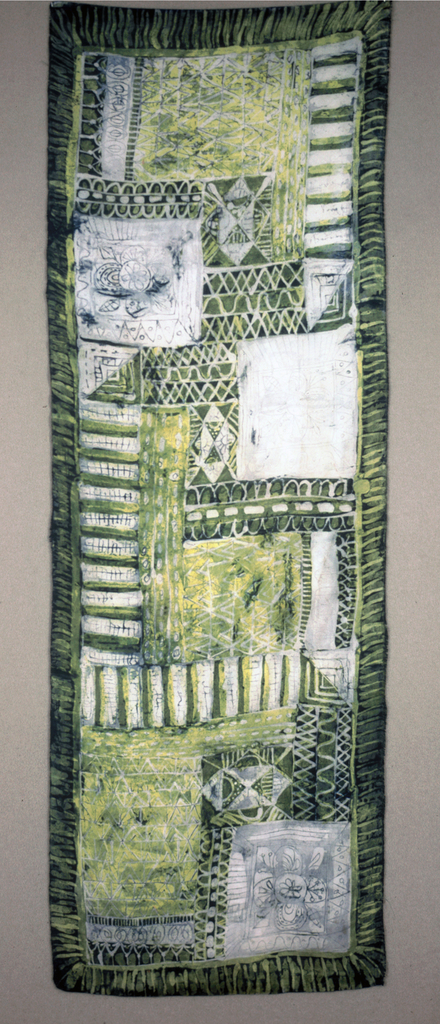 This is a Scarf. It was designed by Mary Dumas. It is dated 1935–71 and we acquired it in 1974. Its medium is silk and its technique is resist dyed. It is a part of the Textiles department.