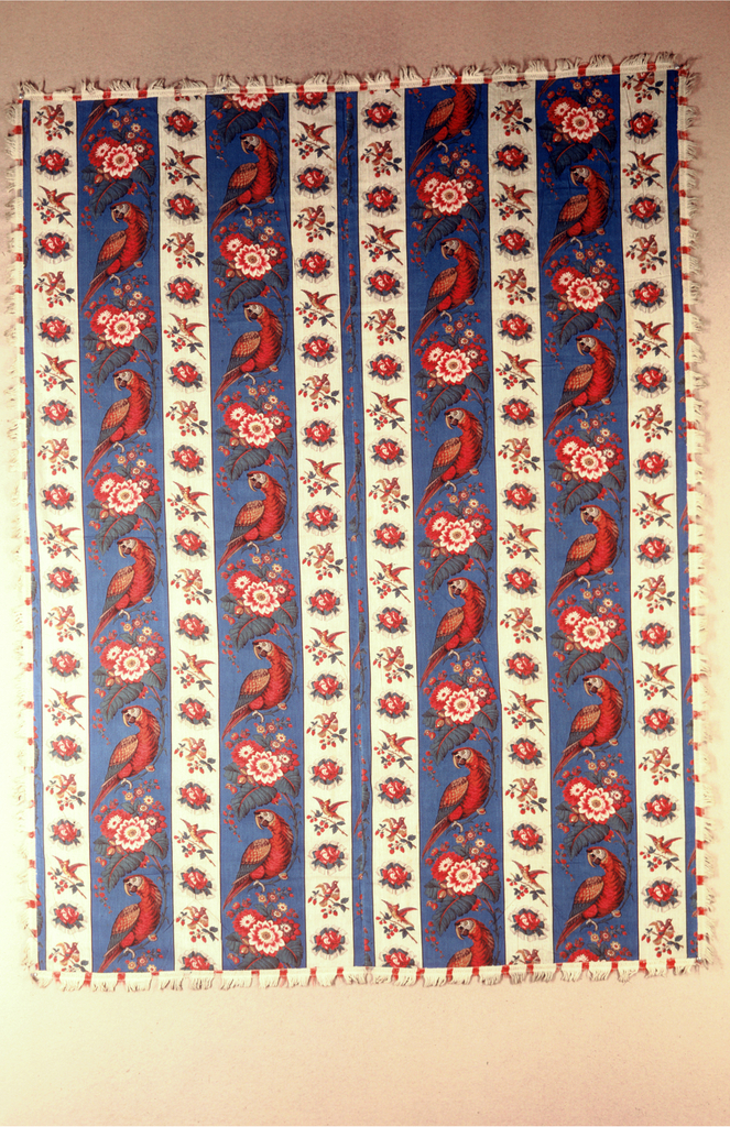 This is a Textile. It is dated 1850–1900 and we acquired it in 1974. Its medium is cotton and its technique is printed by engraved roller on plain weave; woven cotton tape with cotton weft-loop fringe (2 cm sections of red wool at 6 cm intervals); attached to 4 sides; note crossed and re-crossed warps. It is a part of the Textiles department.