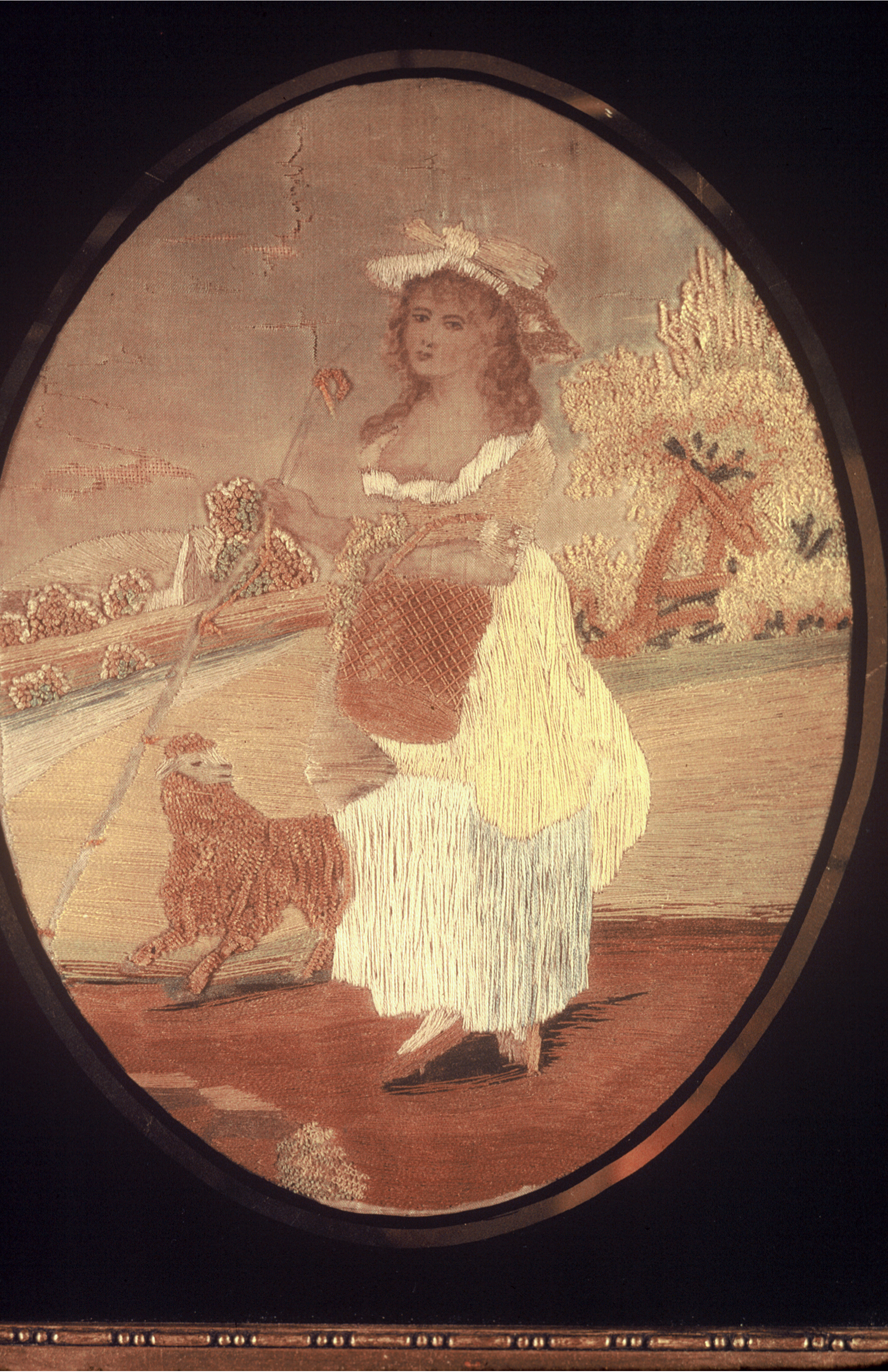 This is a Embroidered picture. It is dated ca. 1800 and we acquired it in 1974. Its medium is silk embroidery with paint on silk foundation and its technique is embroidered in satin, stem, running and knotted stitches on plain weave; hands, face and background are painted. It is a part of the Textiles department.