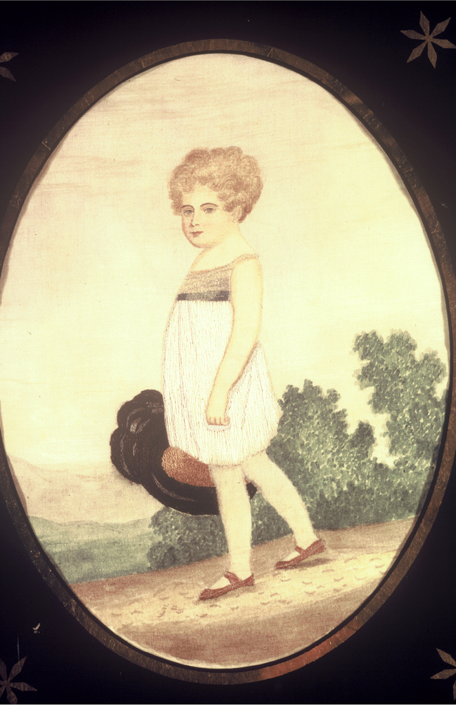 This is a Embroidered picture. It is dated ca. 1800 and we acquired it in 1974. Its medium is silk embroidery and paint on a silk foundation and its technique is embroidered in stem stitch on a plain weave foundation; hands and face painted. It is a part of the Textiles department.