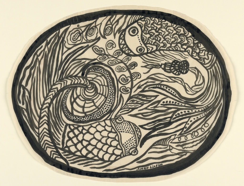 This is a Drawing. It was designed by Simon Lissim. We acquired it in 1974. Its medium is brush and black gouache, black ink on tracing paper. It is a part of the Drawings, Prints, and Graphic Design department.