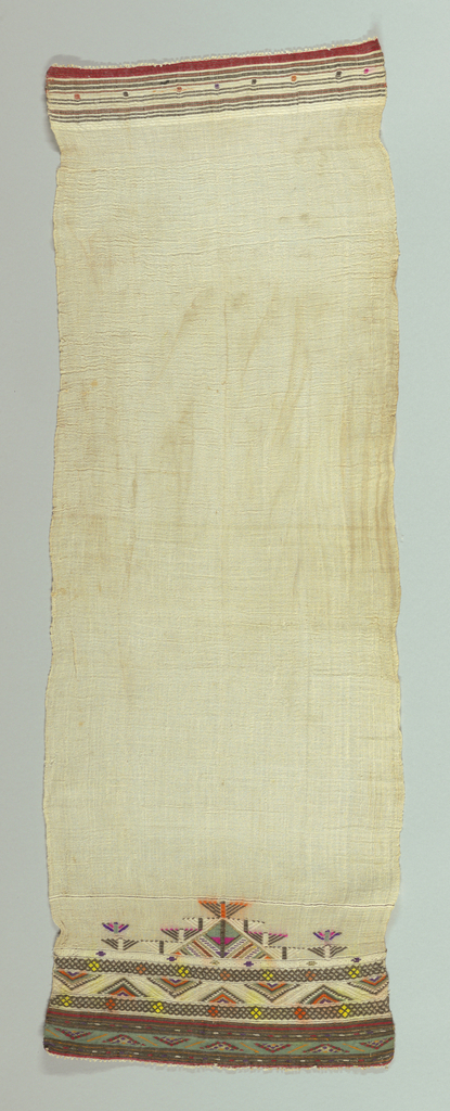 This is a Towel. It is dated 1920–29 and we acquired it in 1974. Its medium is cotton, silk, metal-wrapped cotton and its technique is plain weave with discontinuous supplementary weft; ends finished with overhand knots of warp clipped at the base of the knot with no fringe; warp over spun, z-twist. It is a part of the Textiles department.