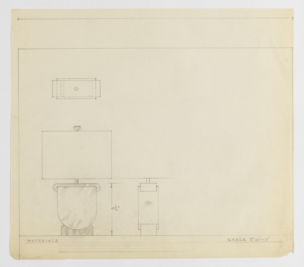 Inscribed in graphite, lower left: MATERIALS; in graphite, lower right: SCALE 3" = 1'-0"; in graphite: object dimensions
