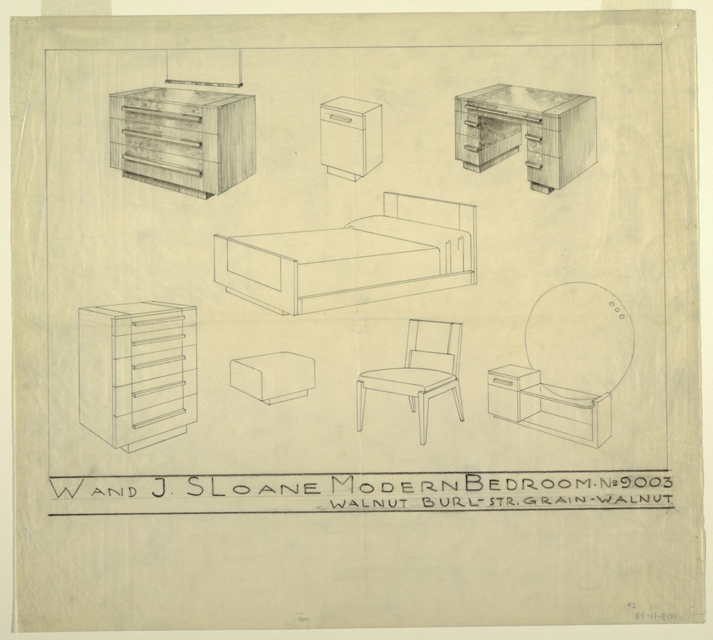 Inscribed in graphite, lower left: W AND J. SLOANE MODERN BEDROOM • NO 9003 / WALNUT BURL- STR. GRAIN -WALNUT