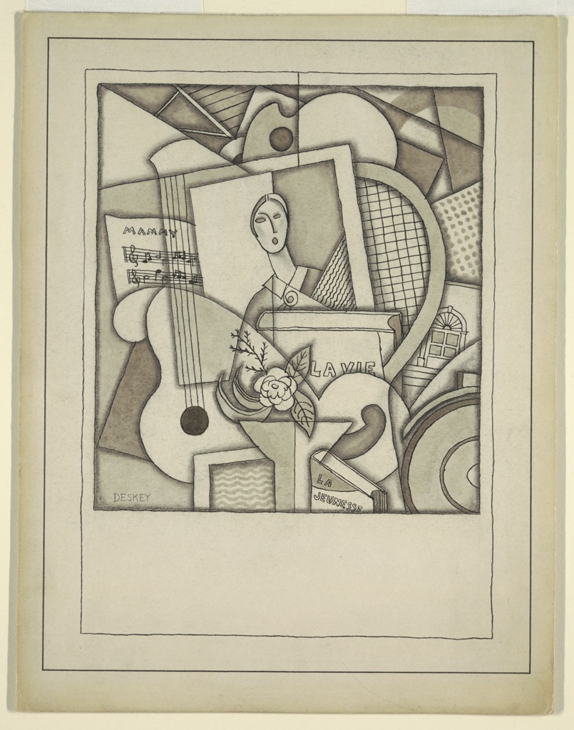This is a Drawing. It was designed by Donald Deskey and from the office of Donald Deskey Associates and drafted by Donald Deskey. It is dated 1927–28 and we acquired it in 1975. Its medium is pen and black ink, brush and black, gray wash, graphite on cream illustration board. It is a part of the Drawings, Prints, and Graphic Design department.