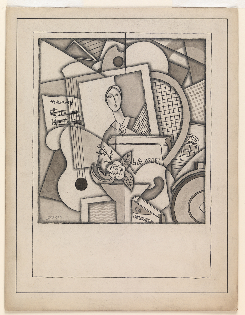 This is a Drawing. It was designed by Donald Deskey and from the office of Donald Deskey Associates and drafted by Donald Deskey. It is dated 1927–28 and we acquired it in 1975. Its medium is pen and black ink, brush and black, gray wash, graphite on cream illustration board. It is a part of the Drawings, Prints, and Graphic Design department.