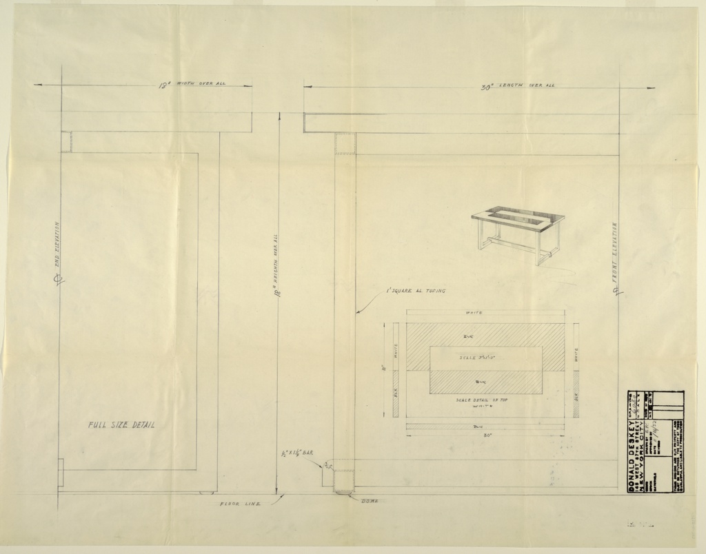 Architect’s stamp in black ink, lower right: DONALD DESKEY / 145 WEST 57TH STREET / NEW YORK CITY [with misc. drafting information]