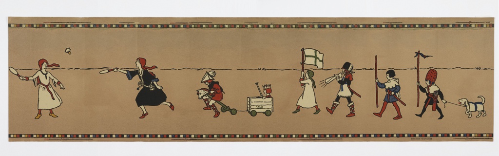 This is a frieze. It is dated 1900–30 and we acquired it in 1975. Its medium is block-printed on oatmeal paper. It is a part of the Wallcoverings department.