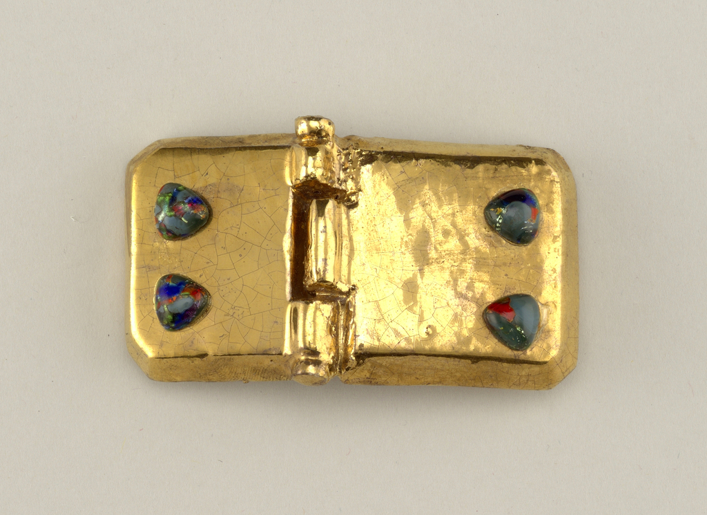 - molded, pressed, folded and stippled gold sheet with applied pigment.