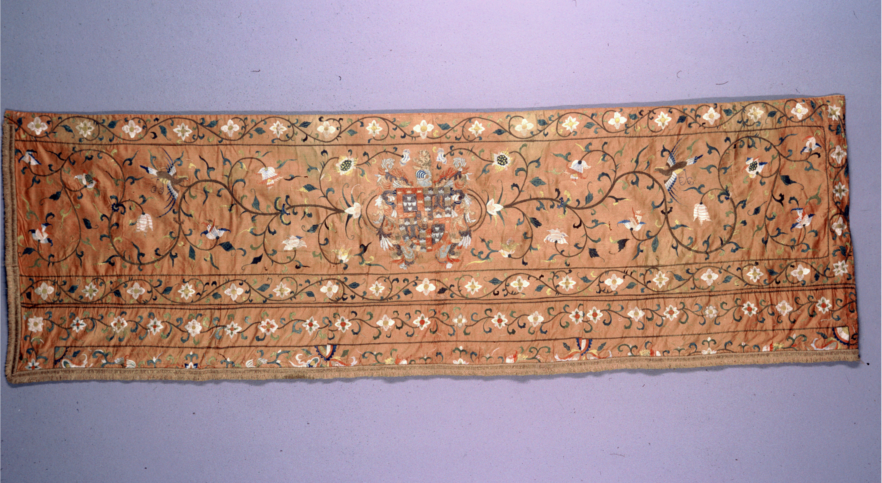 This is a Hanging. It is dated 18th century and we acquired it in 1975. Its medium is silk, metallic thread and its technique is split, satin, stem and couching stitches on 5-harness satin. It is a part of the Textiles department.