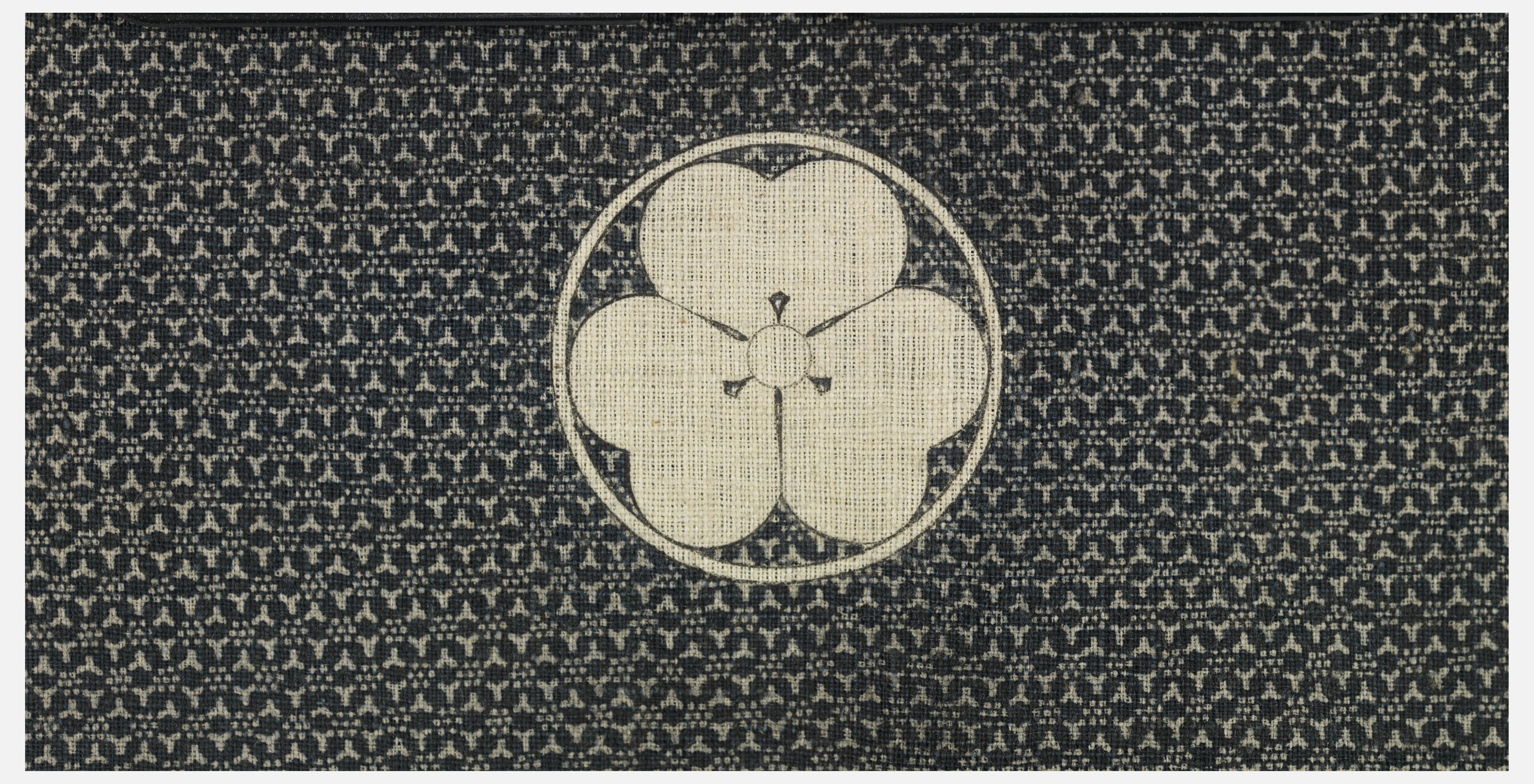 The delicate floral and geometric pattern that decorates this kimono is so fine as only to be revealed through close examination. Tiny stencil patterns like these, called komon, evoke samurai aesthetics of restraint, and were once worn only by warriors and the nobility. Some families even had exclusive rights to certain patterns. The large stylized floral designs added at the shoulders are feudal family crests.