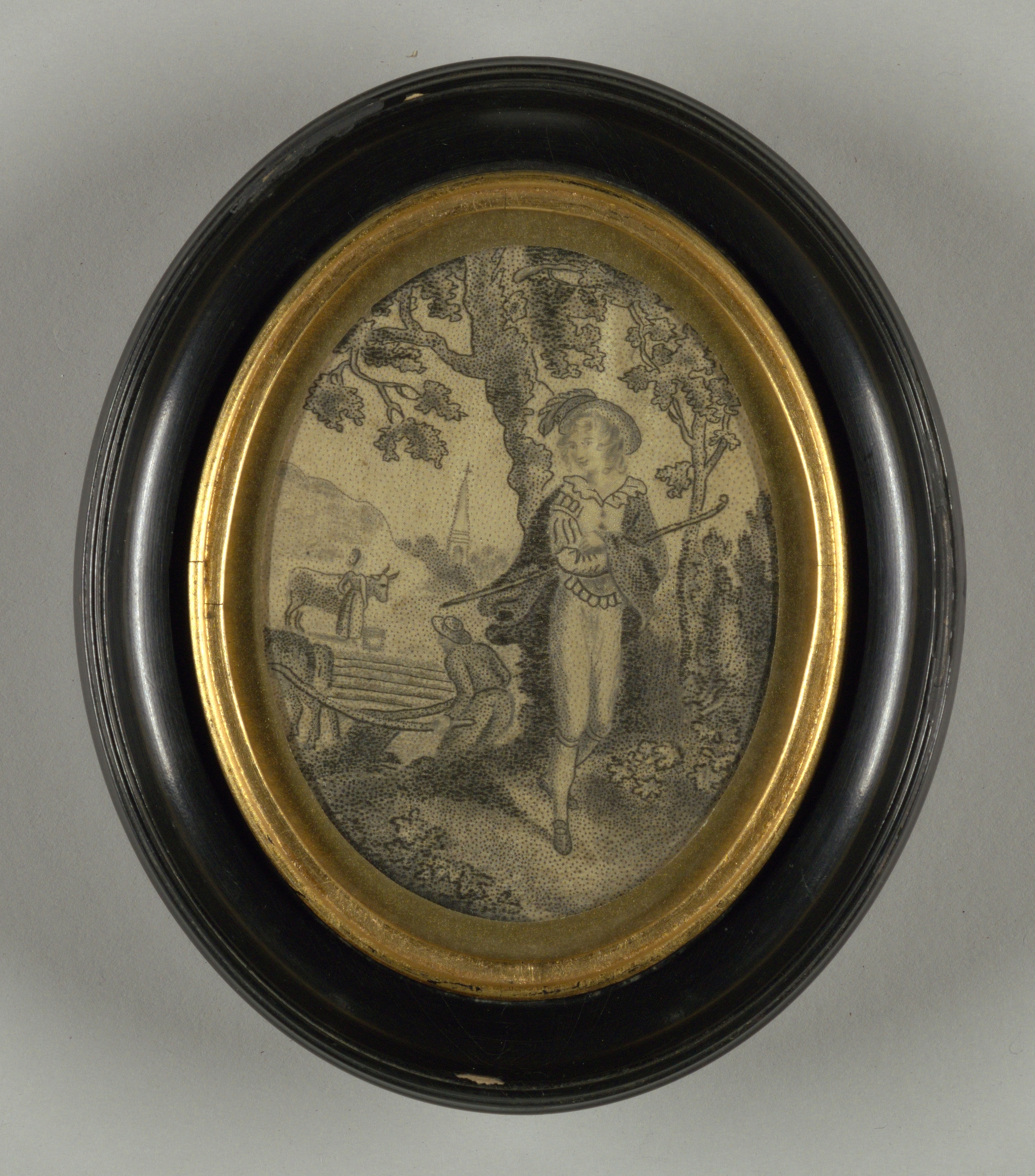 This is a Embroidered picture. It is dated early 19th century and we acquired it in 1975. Its medium is silk embroidery on silk foundation and its technique is embroidered in stem, speckling and running stitches on plain weave foundation. It is a part of the Textiles department.