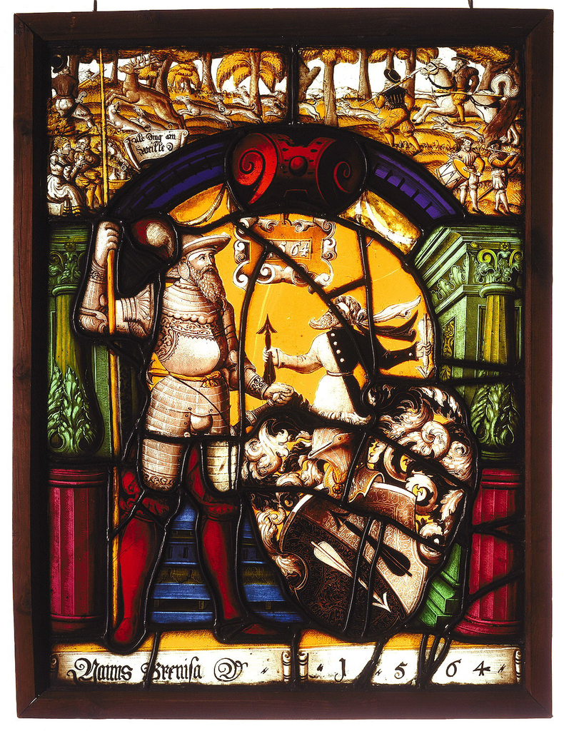 This is a panel. It was made for (as the client) Hanns Brenisa. It is dated 1564 and we acquired it in 1976. Its medium is stained glass, silver stain, enamel, metal. It is a part of the Product Design and Decorative Arts department.