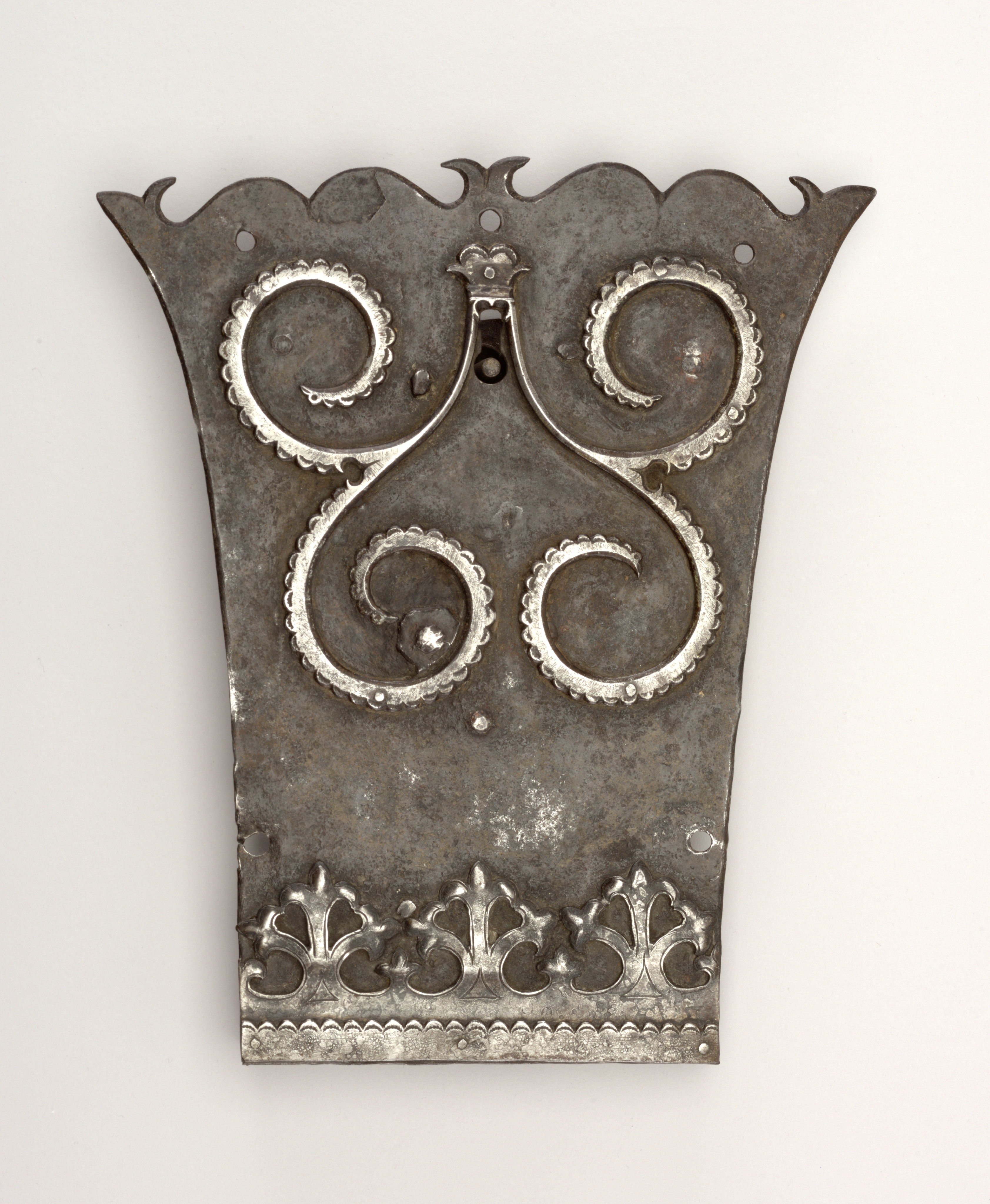 This is a Lock with backplate, key. It is dated 1724 and we acquired it in 1976. Its medium is gilt iron. It is a part of the Product Design and Decorative Arts department.