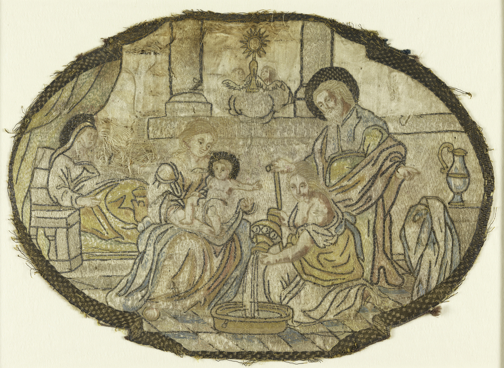 This is a Embroidered picture. It was made for (as the client) Görg Schwÿtzer. It is dated 17th century and we acquired it in 1976. Its medium is silk and metal on silk over linen and its technique is split, stem, long and short and couched metal wrapped silk on eight harness satin over plain weave linen. embroidery (some through two layers of cloth, some through one). uncounted stitches. It is a part of the Textiles department.